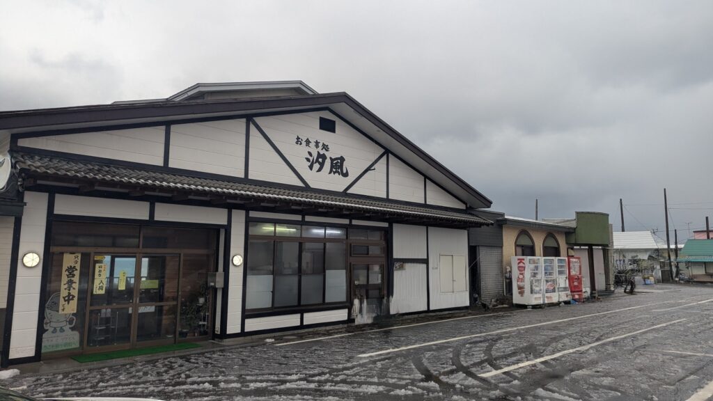 お店があるのは、鰺ヶ沢の海岸沿い。通称「焼きイカ通り」と呼ばれるエリアに、ドライブイン汐風はあります。