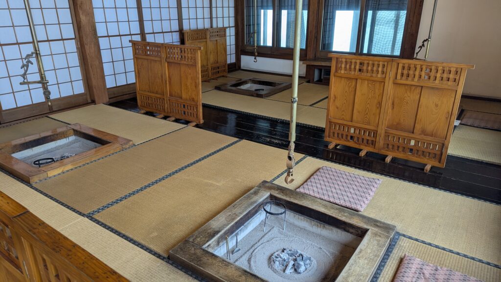 別館の扉を開けると、そこは木の香りが漂う温かい空間。 古民家風の造りで、食事処には囲炉裏(いろり)が切られています。